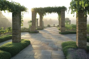 Elegant pathway through a vineyard, lined with landscaping and lanterns