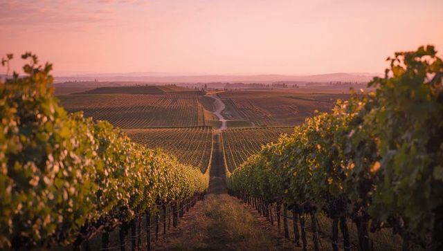 Vineyard sunset scenic pathway idyllic rural landscape.