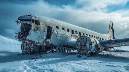 An old airplane wreck sits in a vast snowy expanse, with damaged fuselage and frozen components silhouetted against a cloudy sky. Nature begins to reclaim the site
