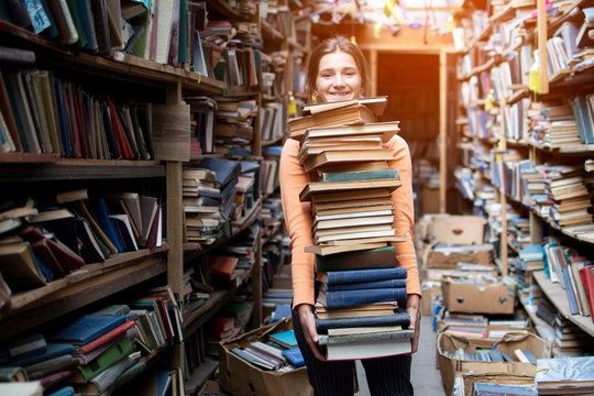 girl student carries a large stack of books in the library, preparation for study, knowledge is power, concept
