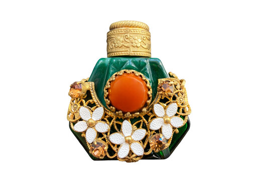vintage perfume bottle of malachite glass with brass decorative braid made in Czechoslovakia 1960-70 on isolated transparent background