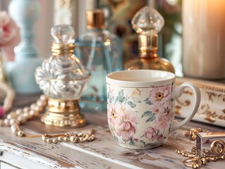 Displaying ornate glass perfume bottles on antique wooden vanity with warm bokeh light