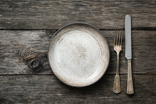 Table setting with vintage silverware or cutlery and empty plate on rustic wood. Top view with copy space for text