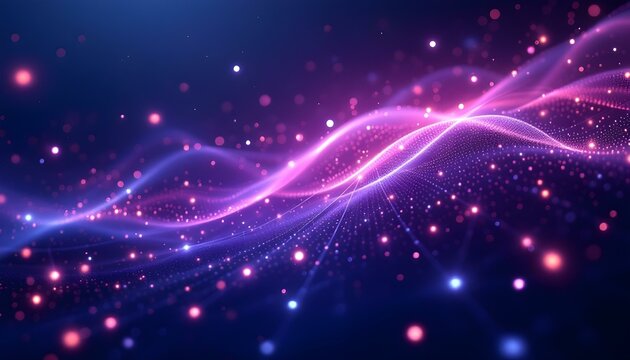 An abstract configuration of pink and purple glowing dots connected by laser-like lines across a dark violet background. Abstract purple color digital particles wave with bokeh and light background