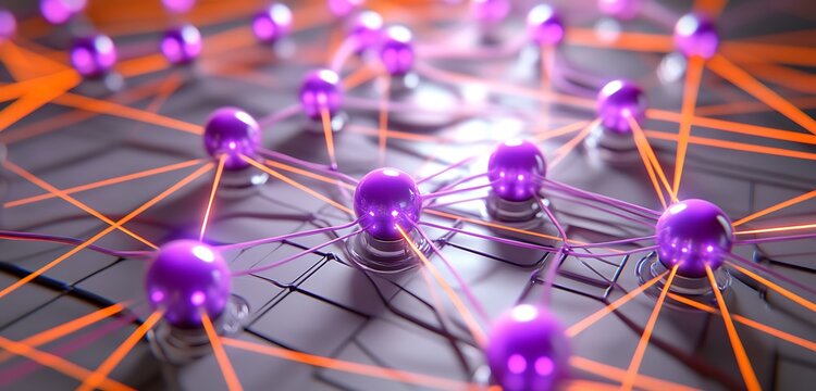 3D neural network with glowing violet nodes overlaid on an orange and gray tech grid