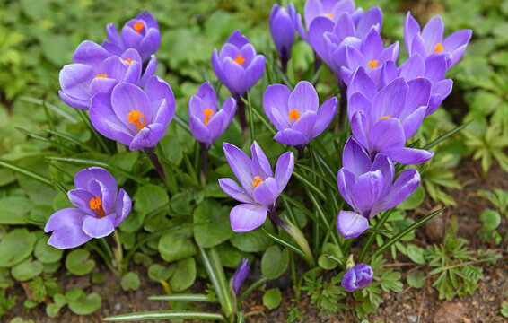 Blooming crocuses – beautiful crocus flowers appearing on the lawn.