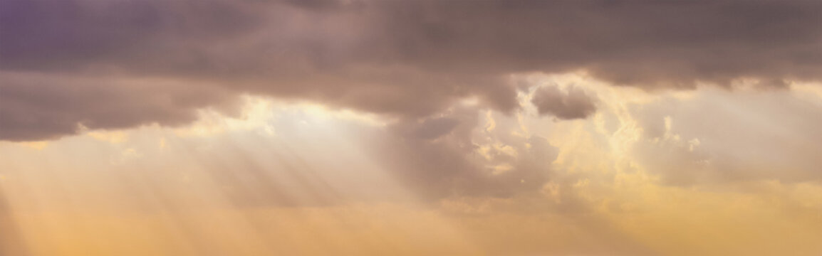 Golden rays of sunlight streaming through heavy violet clouds, illuminating the sky with warm amber tones and creating a sacred, ethereal atmosphere of hope breaking through darkness