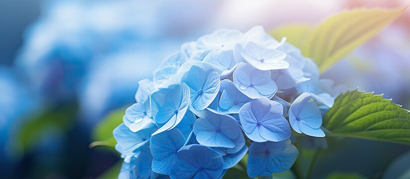 A detailed close up image of a hydrangea flower with a light blue color in a park setting perfect for adding text or designs with copy space
