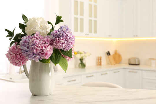 Beautiful Panoramic Spring Nature background with blooming hydrangea flowers. Hortensia Flowers closeup on pink background for website or Web banner