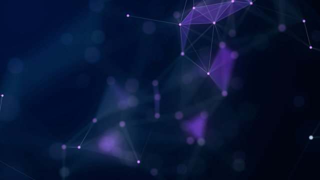 Shapes, dots and lines are connected with shine on blurred background. Appearing of violet shapes.