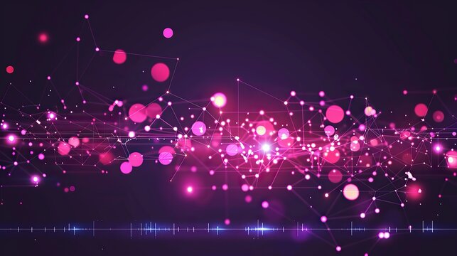 An abstract configuration of pink and purple glowing dots connected by laser-like lines across a dark violet background with a designated text area along the bottom edge