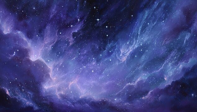 Swirling cosmic nebula flowing in vibrant blue purple fluid gradient with star speckles