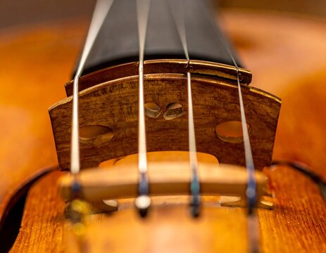 Close-up of a polished violin's bridge and strings against a dark fabric.