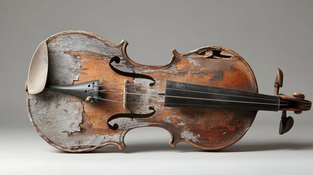 An old and damaged violin with broken strings on display
