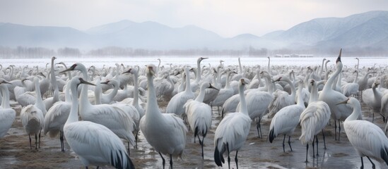 Cranes gathered at feeding sites in their wintering areas