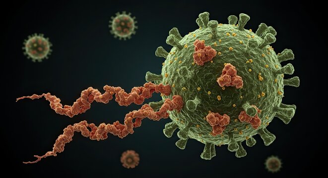 Microscopic view of coronavirus particle with genetic material, illustrating scientific research and medical advancements in virology and disease study