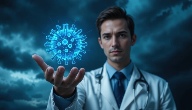 Medical researcher holding a simulated virus, showcasing virology advancements
