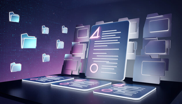 Digital Data Stream: Abstract representation of information, symbolized by glowing file folders floating in a digital space, emphasizing data flow and management.