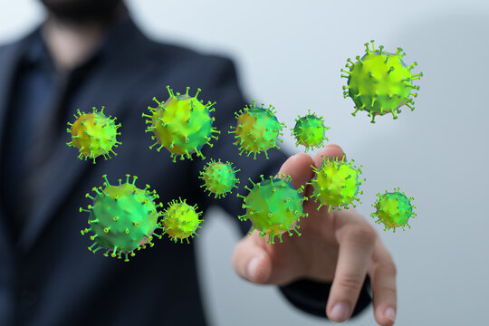 Conceptual image of a businessman touching a virtual virus, representing health concerns, and the spread of di