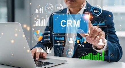 Businessman interacting with a digital crm interface displaying business analytics and charts