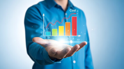 Glowing blue bar graph with cost and quality indicators business finance