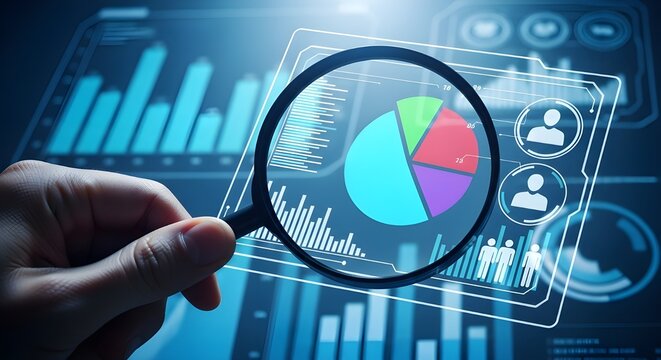 Office worker studying pie charts and bar graphs on glowing virtual analytics dashboard for financial research and corporate planning