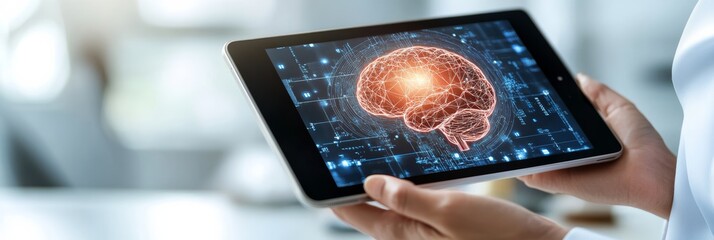 Person holding tablet displaying neural network brain hologram. Concept of AI and future technology.