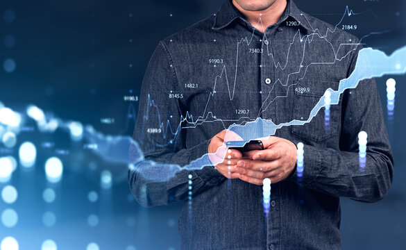 Businessman using smartphone. Stock market graphs, lines and chart