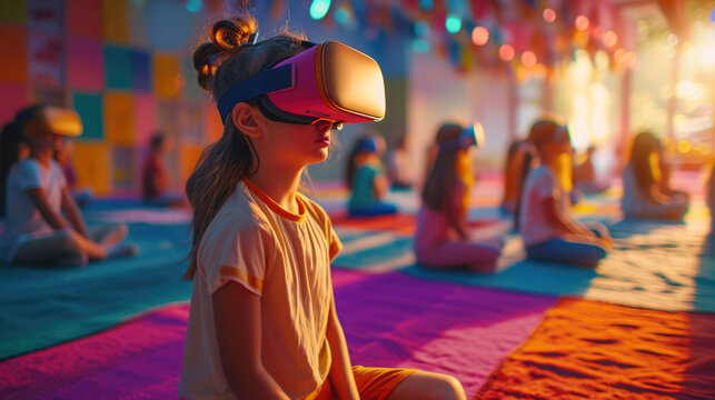 In a vibrant classroom, students engage with virtual reality headsets, experiencing immersive learning opportunities together. Their expressions show excitement and curiosity during the activity