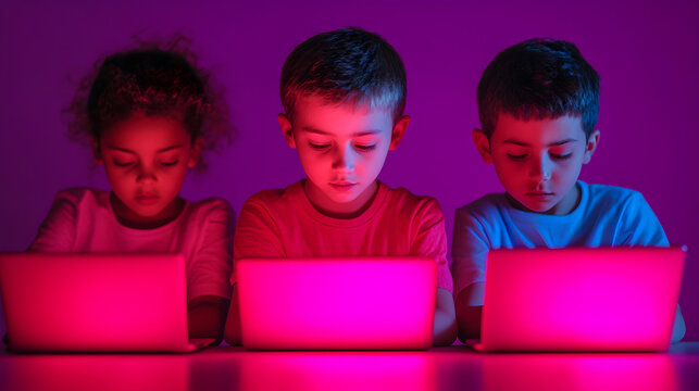 Child sitting at home table focusing on laptop during remote learning with ar hud overlay