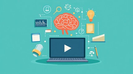Interactive e-learning interface with digital icons and laptop, representing modern online education and virtual learning solutions.