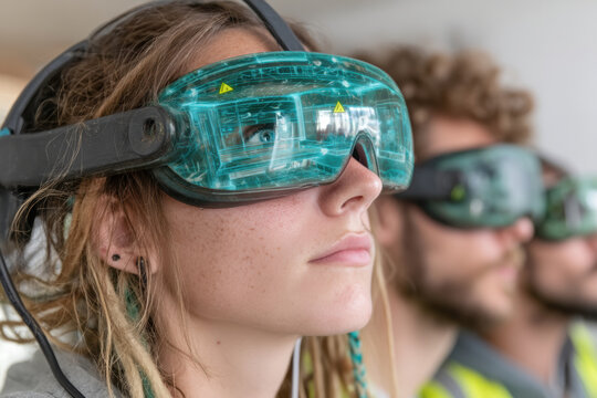Young woman wearing virtual reality goggles training session with other participants background also using VR headsets engaging immersive learning experience modern technology education bright