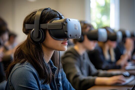 A group of students engages in virtual reality learning in a modern classroom setting, showcasing technology in education.