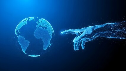 Concept of global network and digital connection. Hand touching a futuristic globe with network lines, representing technology, communication an
