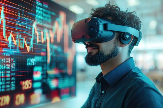 A man wearing a VR headset interacts with digital financial data displayed on a screen, blending technology and finance.