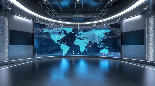 Futuristic tech briefing room with digital wall screens and laptops, talking heads setting