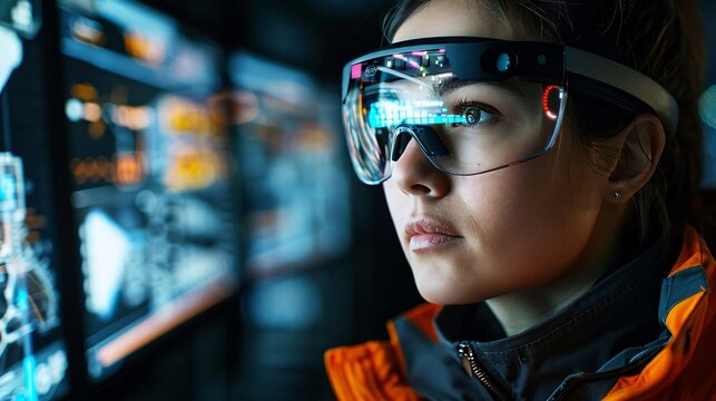 Industrial worker wearing augmented reality (AR) glasses, interacting with a virtual interface to control machinery and processes.