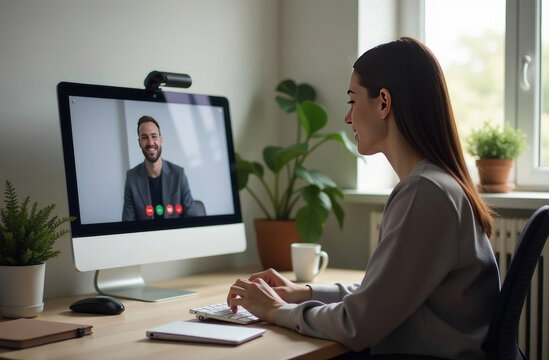 A woman engaging in a virtual meeting on her computer while sitting at her home office during a bright daytime