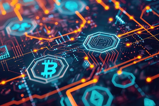 A close-up photograph of a bitcoin displayed on a computer screen, A light tracing of cryptocurrency blockchains against a dimly lit background, AI Generated