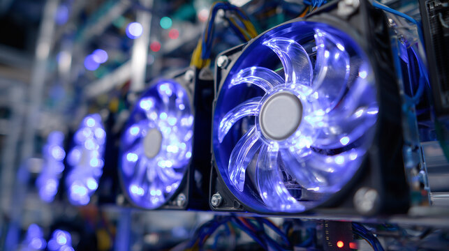 Mining platform perspective showing a sea of graphics cards with synchronized fans spinning under cool LED light