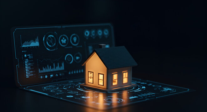 Futuristic smart home concept with data dashboard for energy efficiency and automation