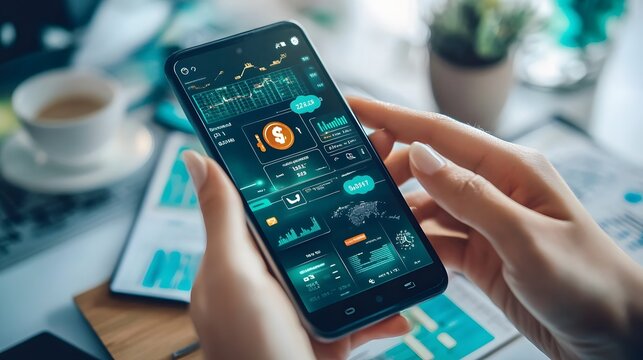 Smart Investing: Close-up shot of a person's hands interacting with a modern smartphone, displaying financial data charts, symbolizing modern investment and technology.