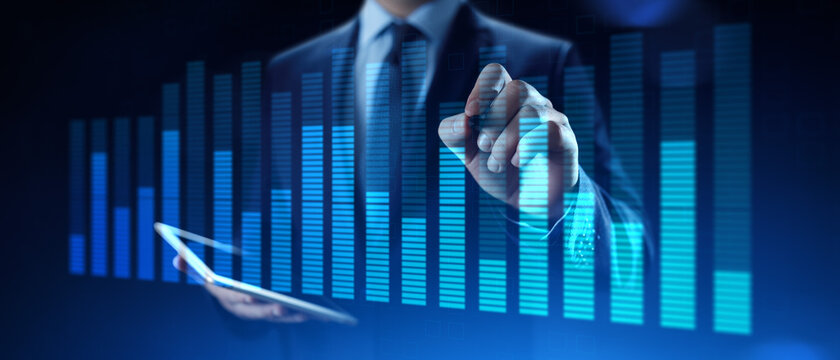 Businessman point to growthing graph and modern computer virtual dashboard analyzing finance sales data and economic growth graph chart and block chain technology.