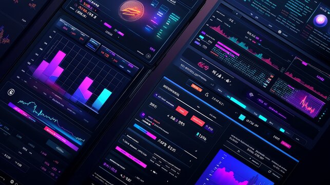 Floating holographic data dashboards with neon line and bar graphs in dark virtual space