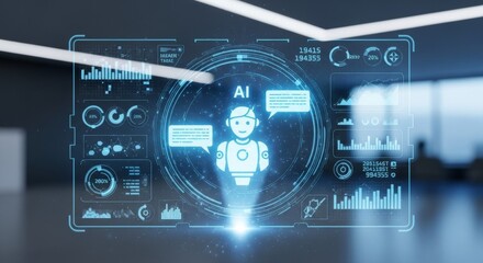 Futuristic ai interface display with virtual assistant hologram in modern office setting