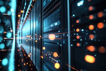 Visual representation of data storage technology in a modern server room with vibrant lights