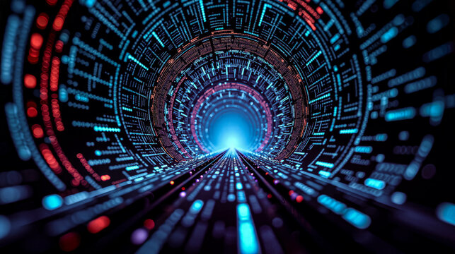 A captivating tunnel composed of vivid blue and red lines stretches into the distance, converging on a bright light, symbolizing data transmission in a virtual realm