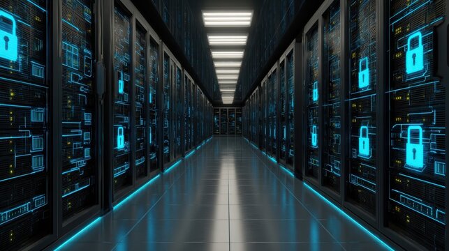 Futuristic server room with blue neon lights, representing technology, data, and network infrastructure