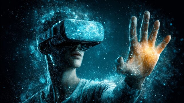 The image showcases an abstract background featuring glowing blue lines and a network of interconnected nodes. The composition highlights a dynamic and futuristic theme
