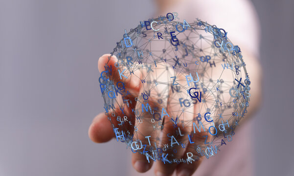 Person interacting with a virtual network sphere. Digital world concept, data connection, global communication, technology, futuristi